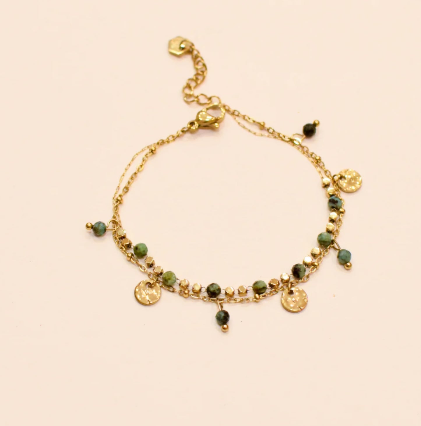 Le bracelet Edna contient de jolies pierres naturelles en tourmaline ou turquoise africaine ainsi que de petites pampilles rondes en double rangée. Il est lumineux, élégants et habillera délicatement votre tenue.