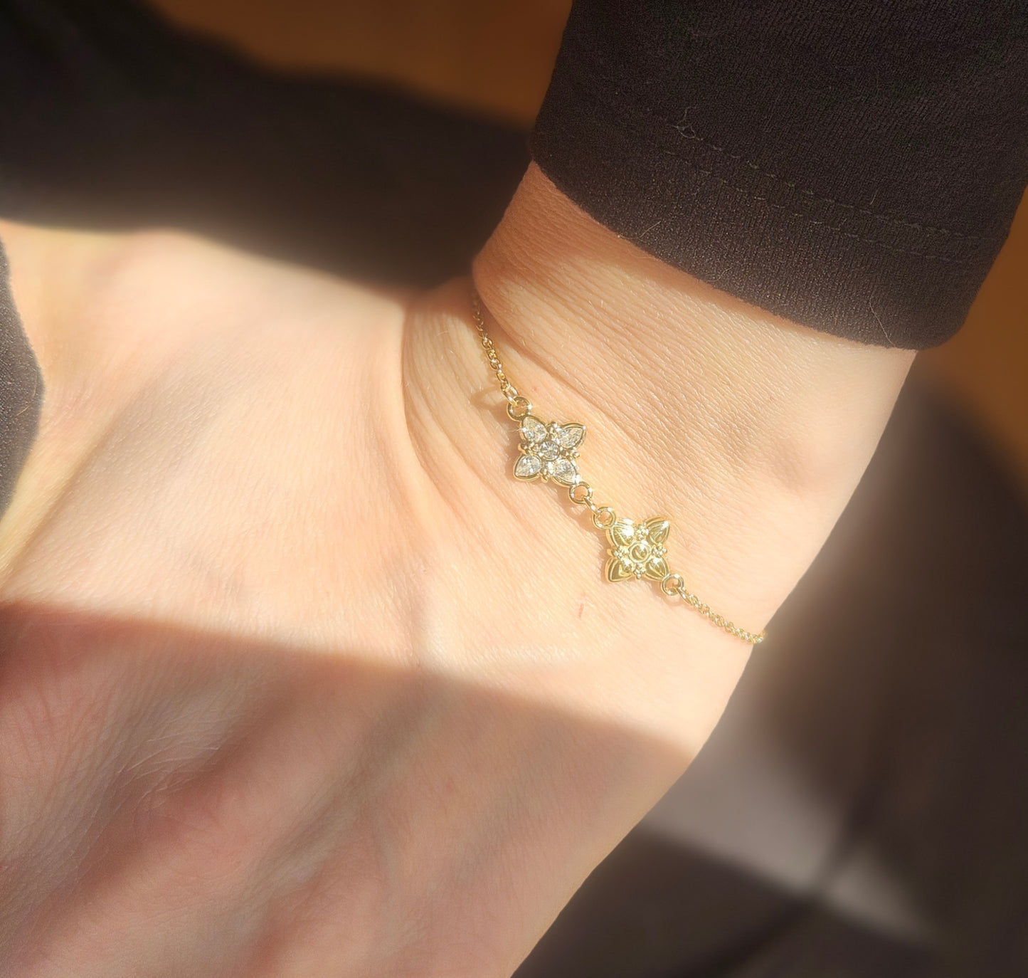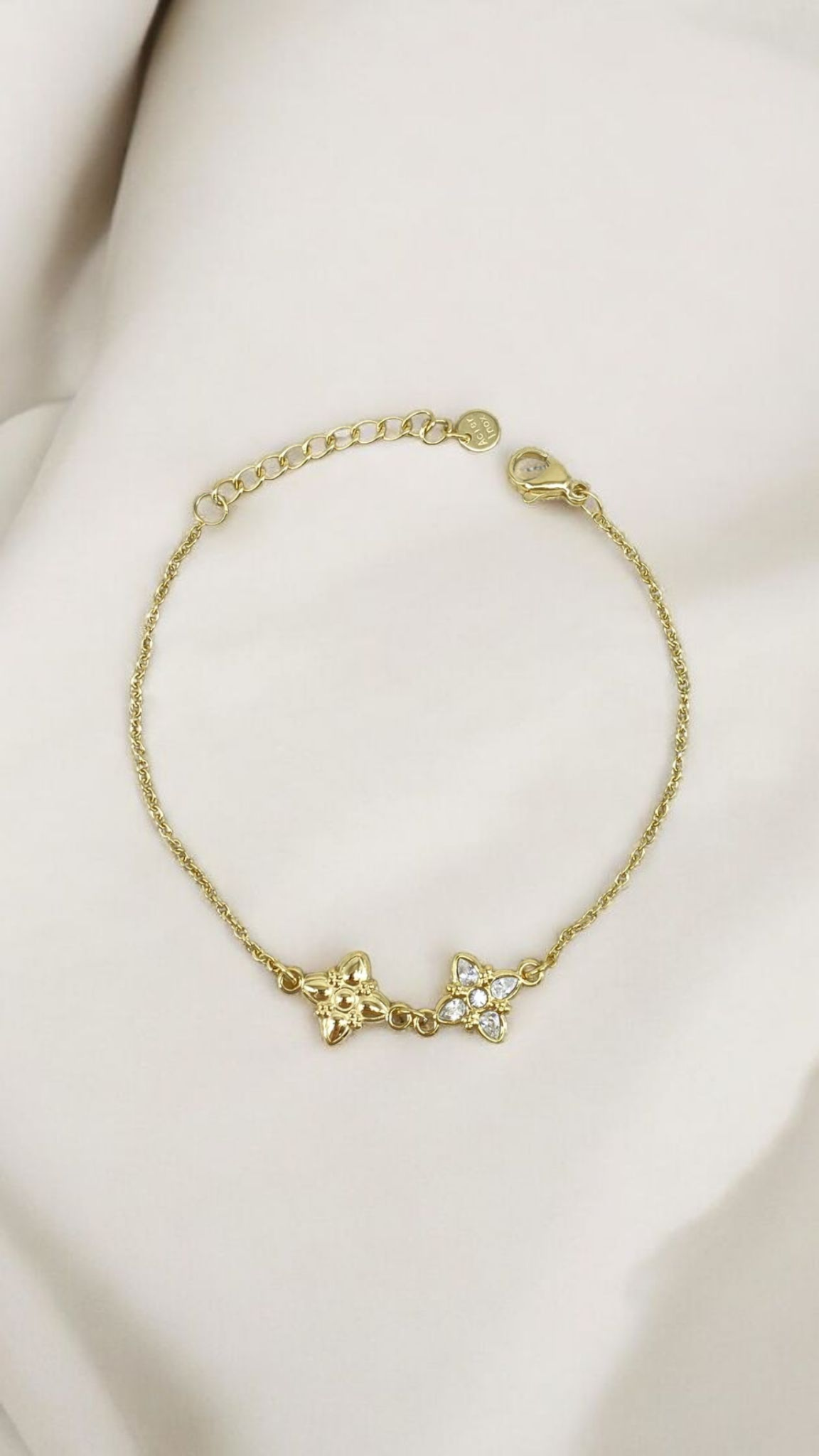 Craquer pour la simplicité du bracelet Elva. Il contient deux jolies trèfles dont un avec des oxydes de zirconium et l'autre mat.