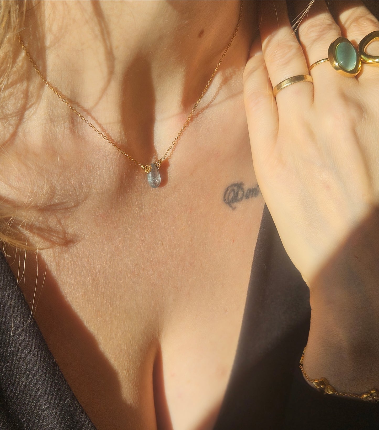 Succombez à la beauté du collier Ivara. Il contient une magnifique pierre naturelle en cyanite bleu, vert avec une couleur simplement sublime et de jolies petites perles dorées qui amènent de l'éclat au bijou.