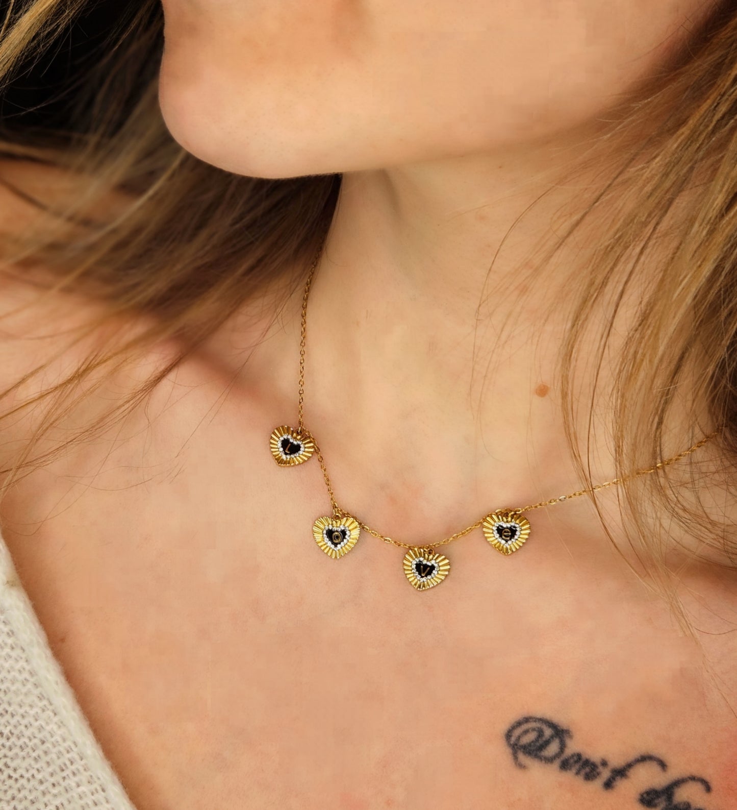 Le collier LOVE a été conçu spécialement pour vous. Il contient 4 magnifiques cœurs striés orné de strass, contenant sur chacun d'entre eux des lettres formant le mot "love".