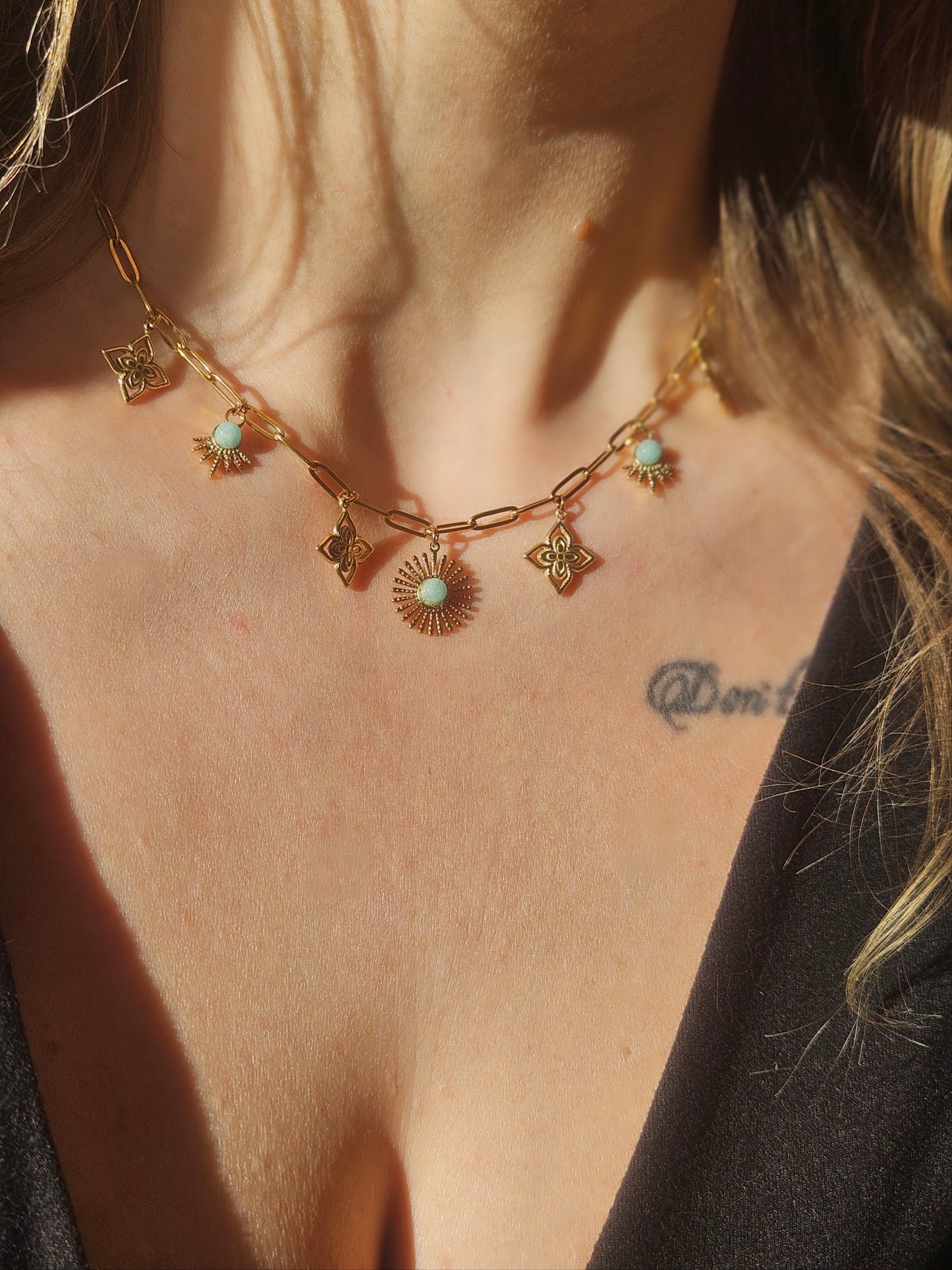 Le collier Vesna est un collier à breloques conçu main. Il contient des jolis trèfles et pendentifs soleil. Il existe en 2 vatiantes: en pierre naturelle de lapis-lazuli ou de pierre d'amazonite. Il s'agit d'un bijou coloré, authentique qui vous sublimera avec beaucoup de style.