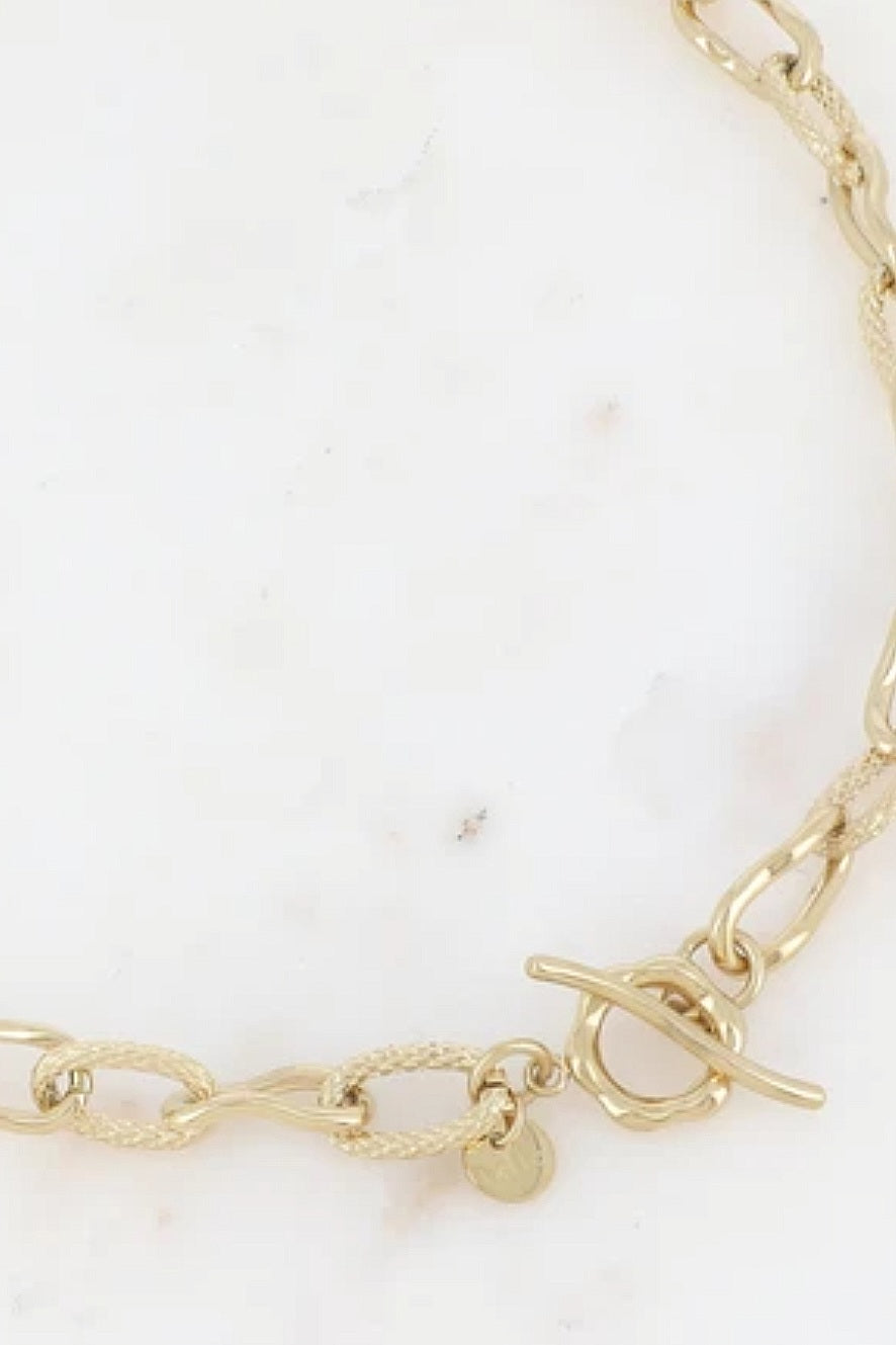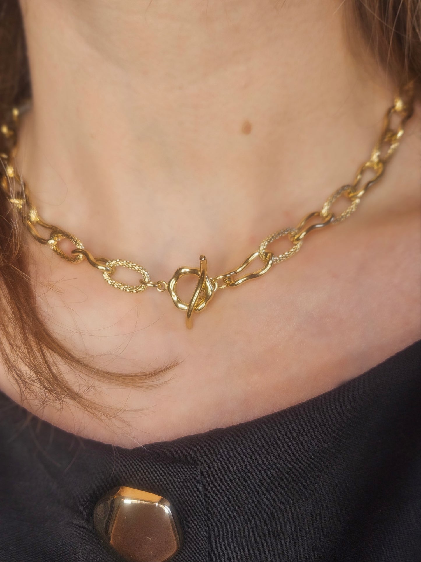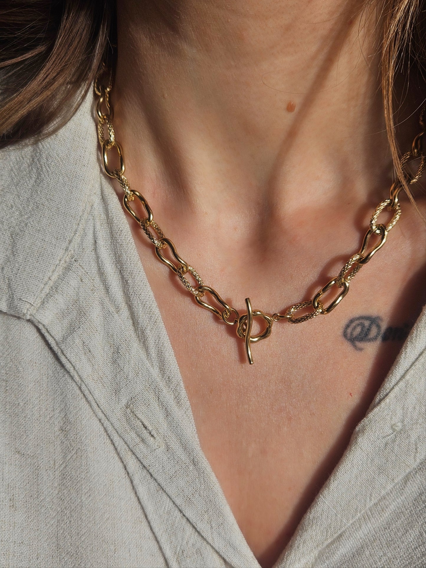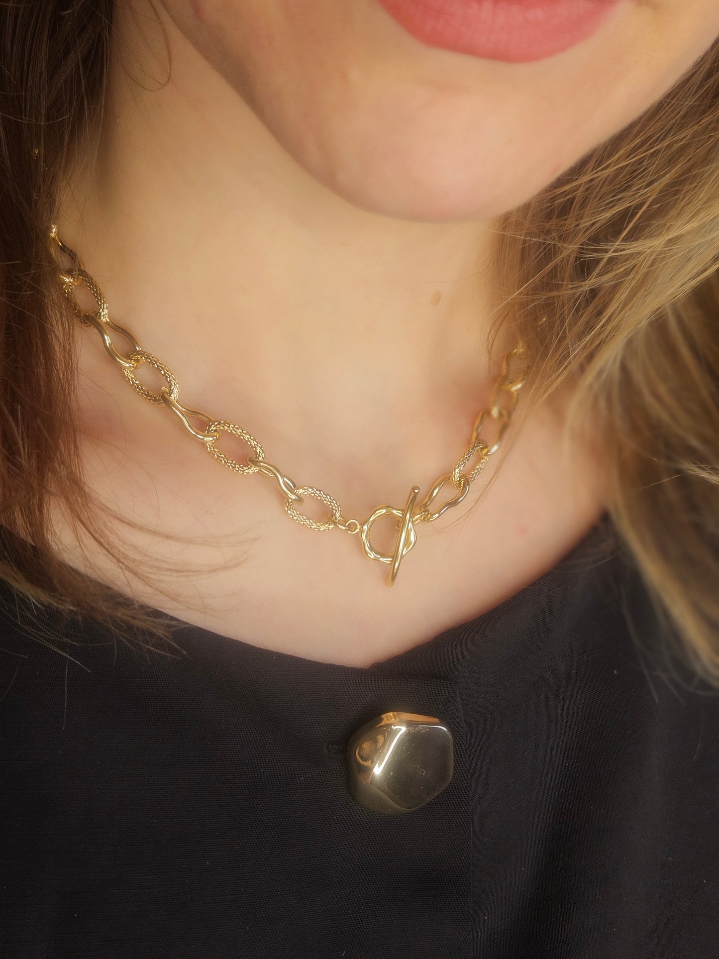 Le collier Aline est un bijou à maillons martelés et lisses à fermoir T. Élégant et rayonnant, il est une pièce forte de cette nouvelle collection.