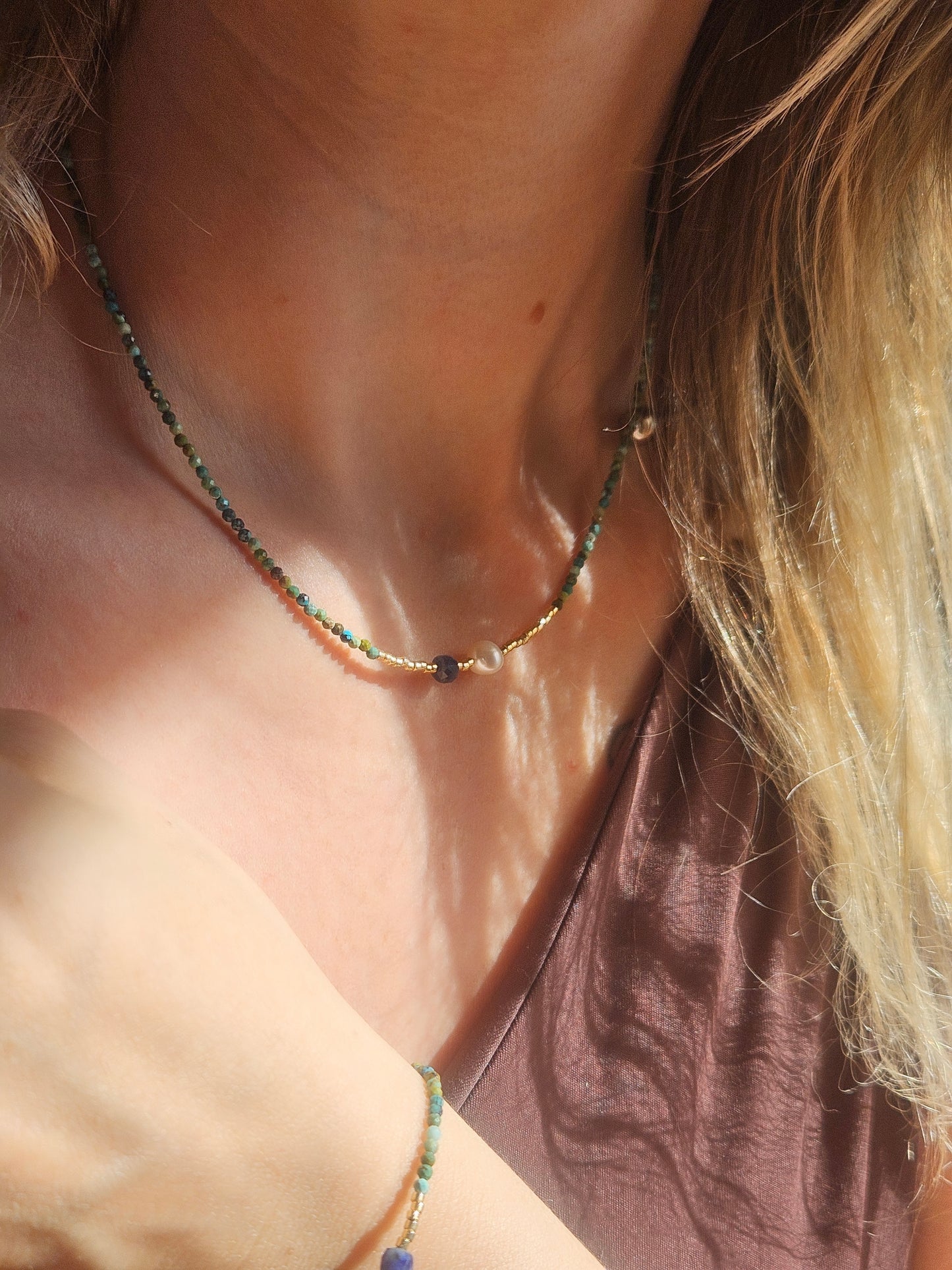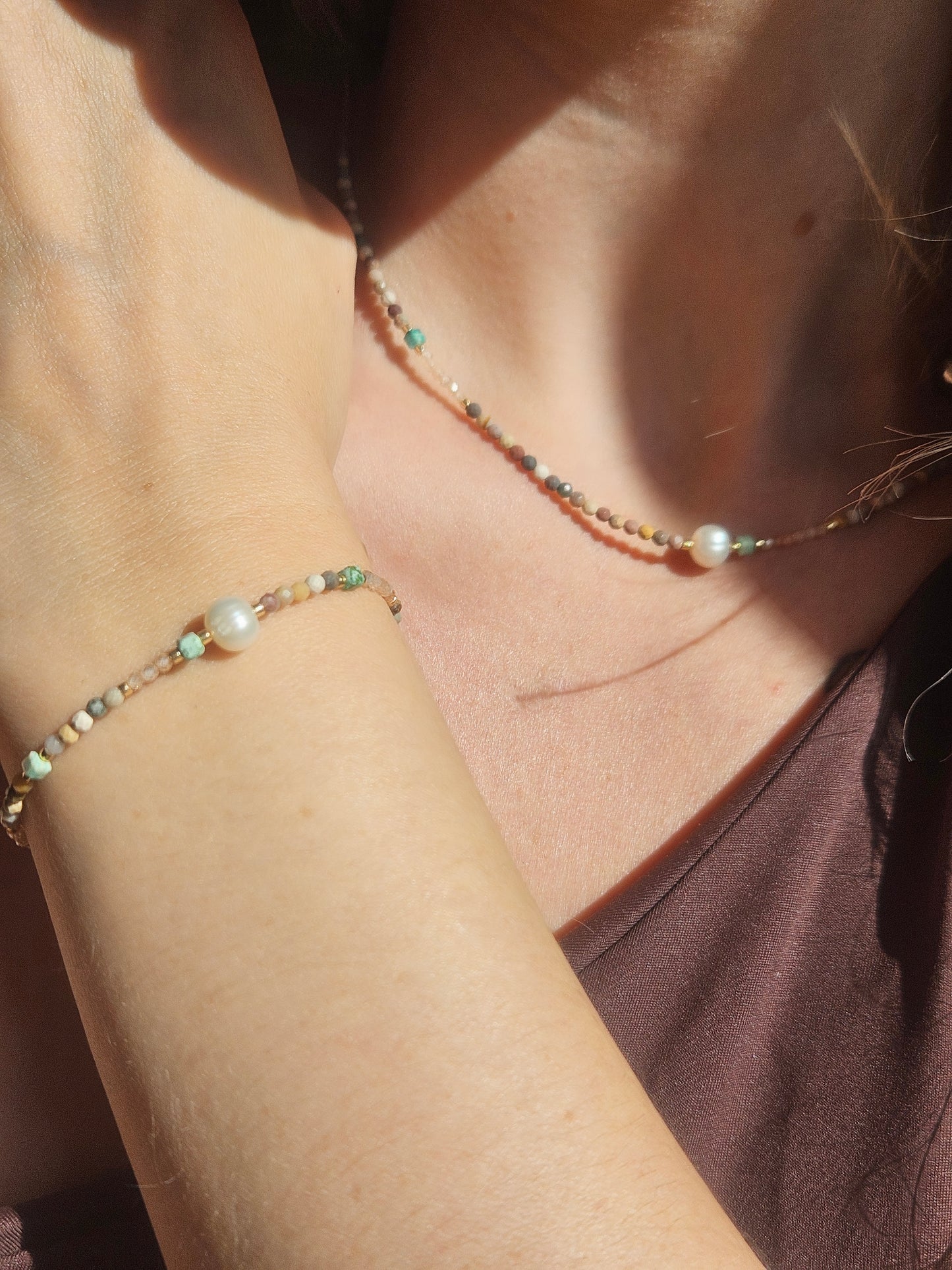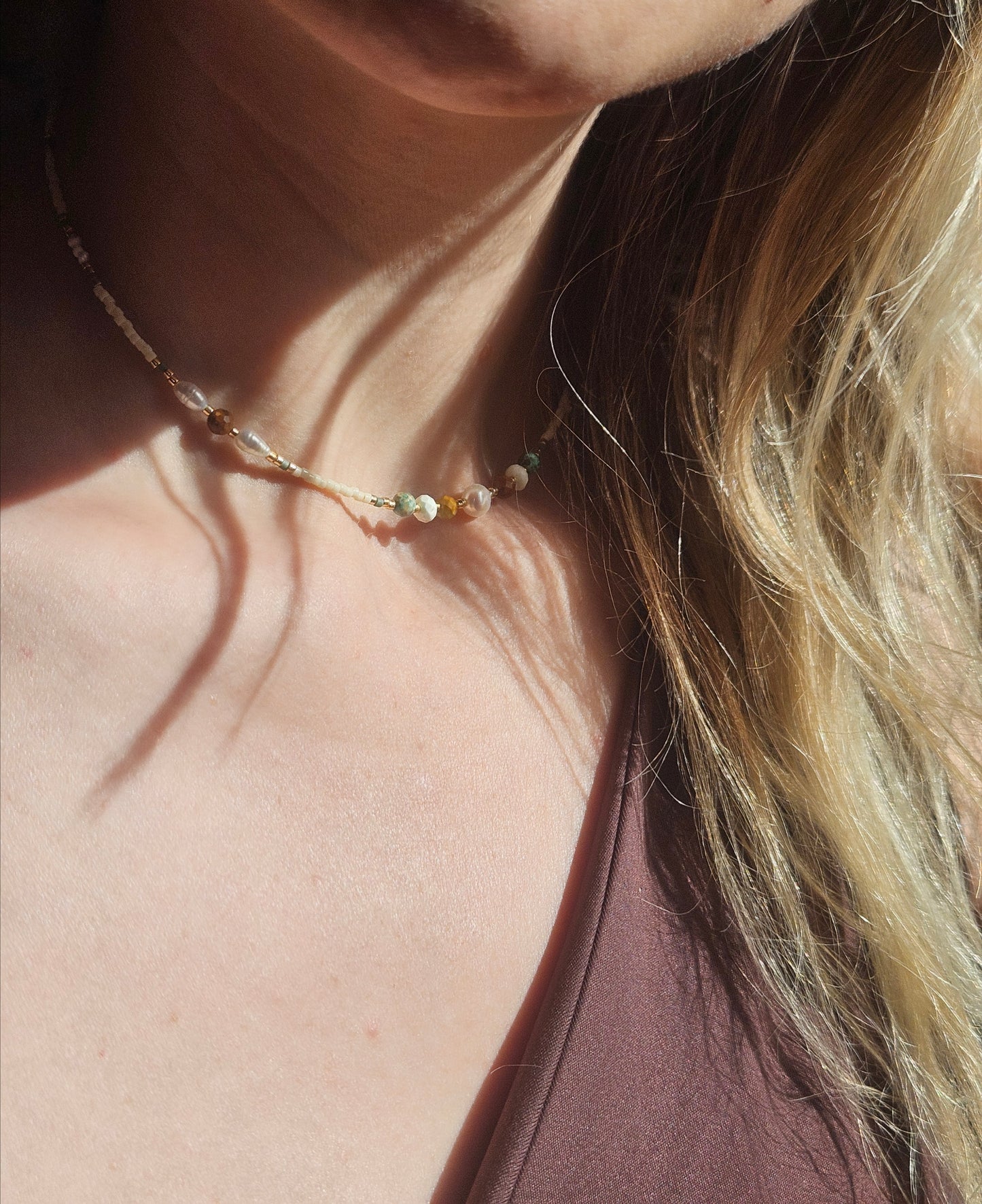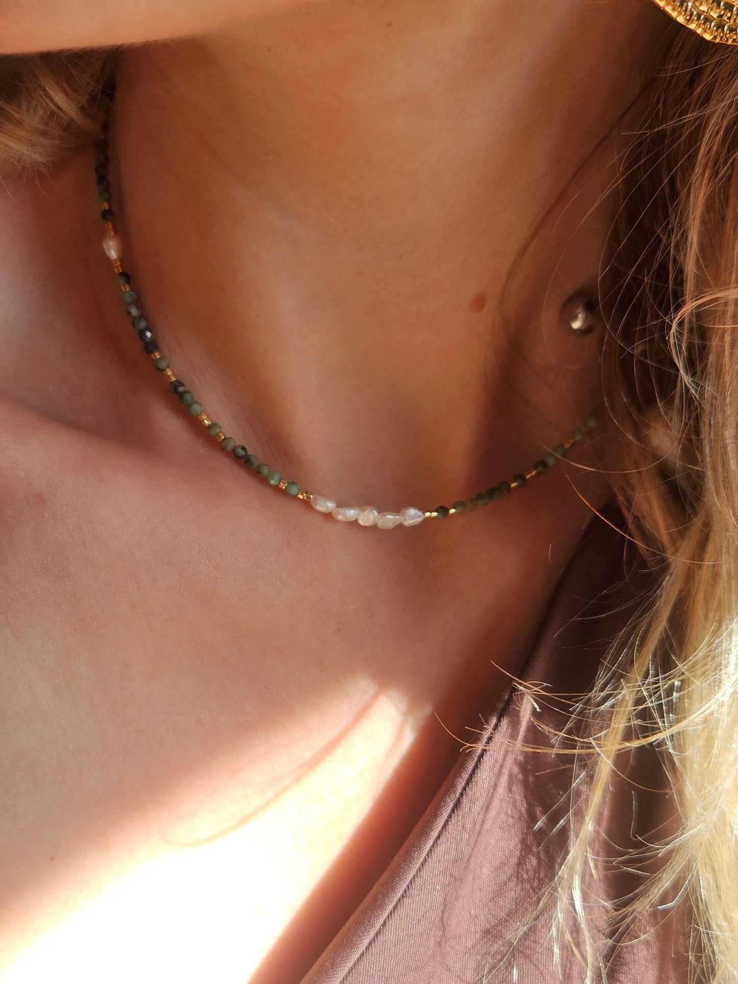 Quelles pierres naturelles sont utilisées? : Turquoise africaine, jaspe beige, tourmaline ou encore perles de culture.