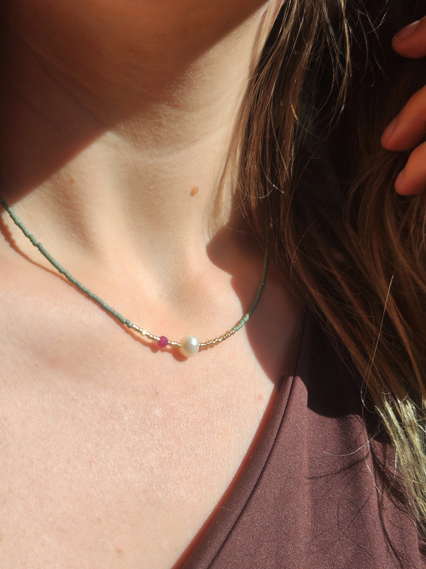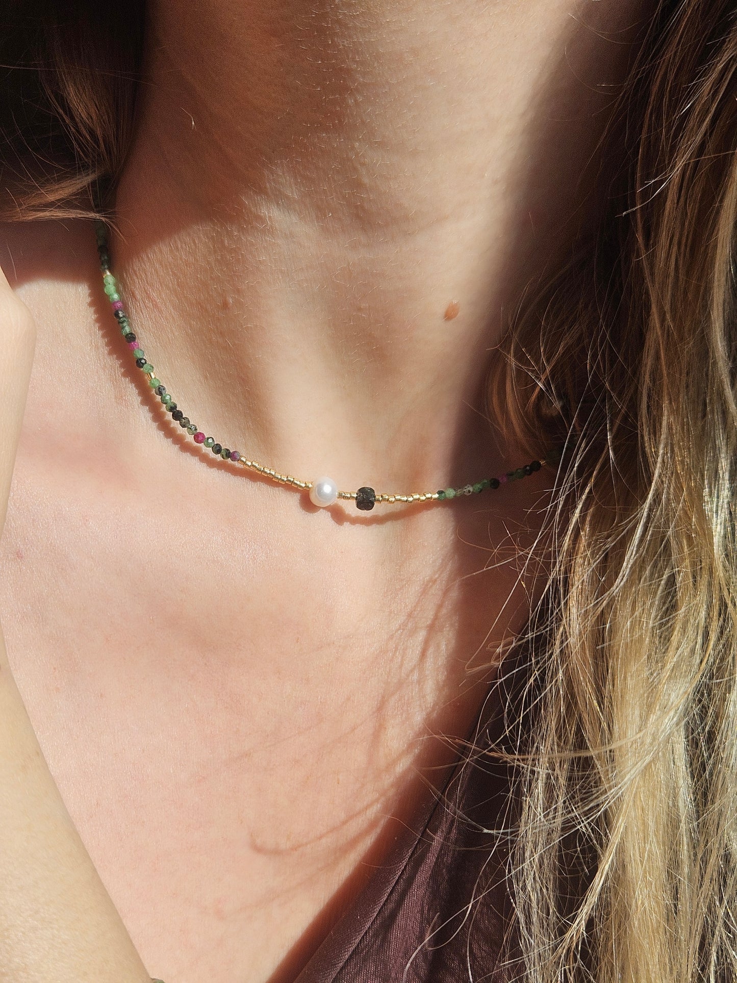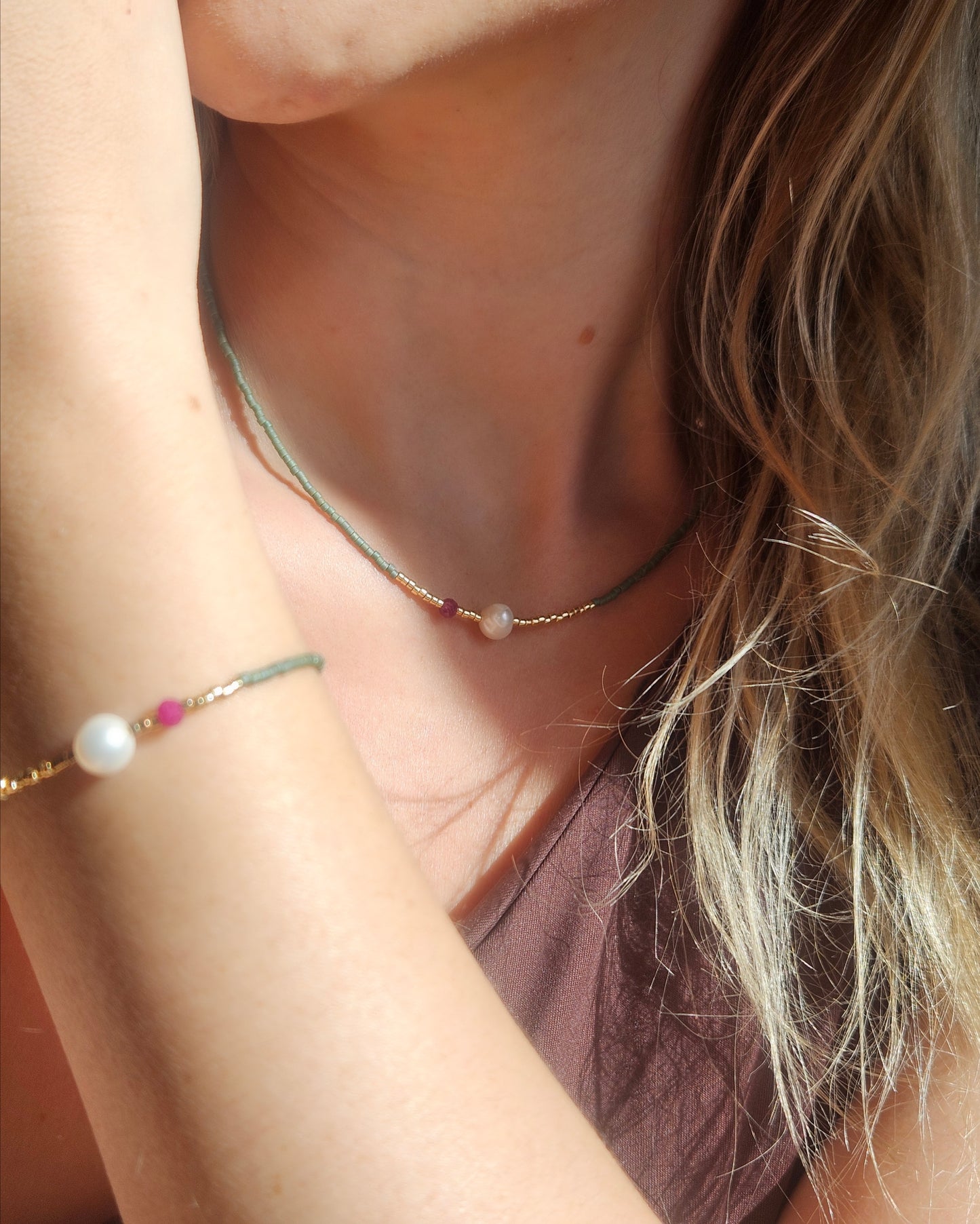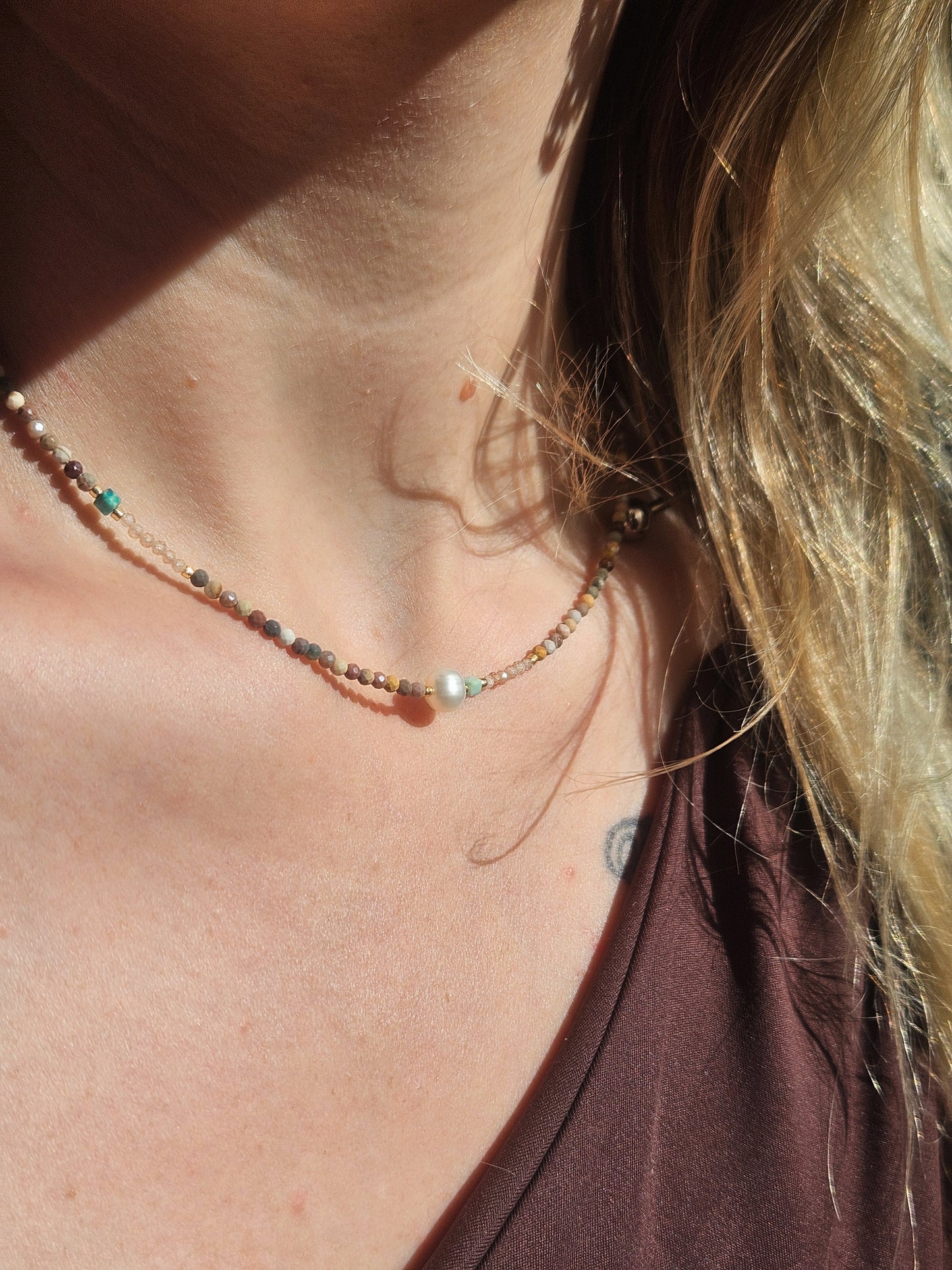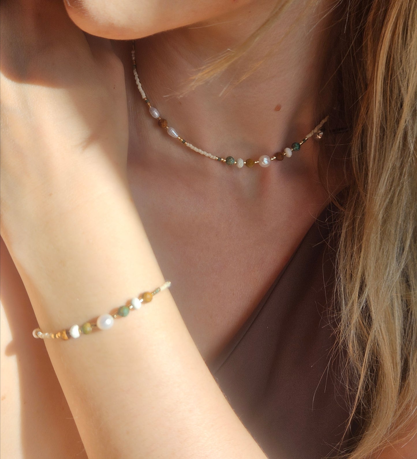 Quelles pierres naturelles sont utilisées? : Turquoise africaine, jaspe beige, tourmaline ou encore perles de culture.