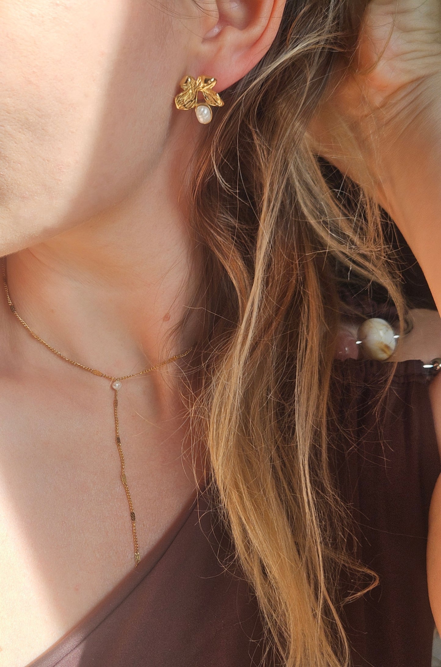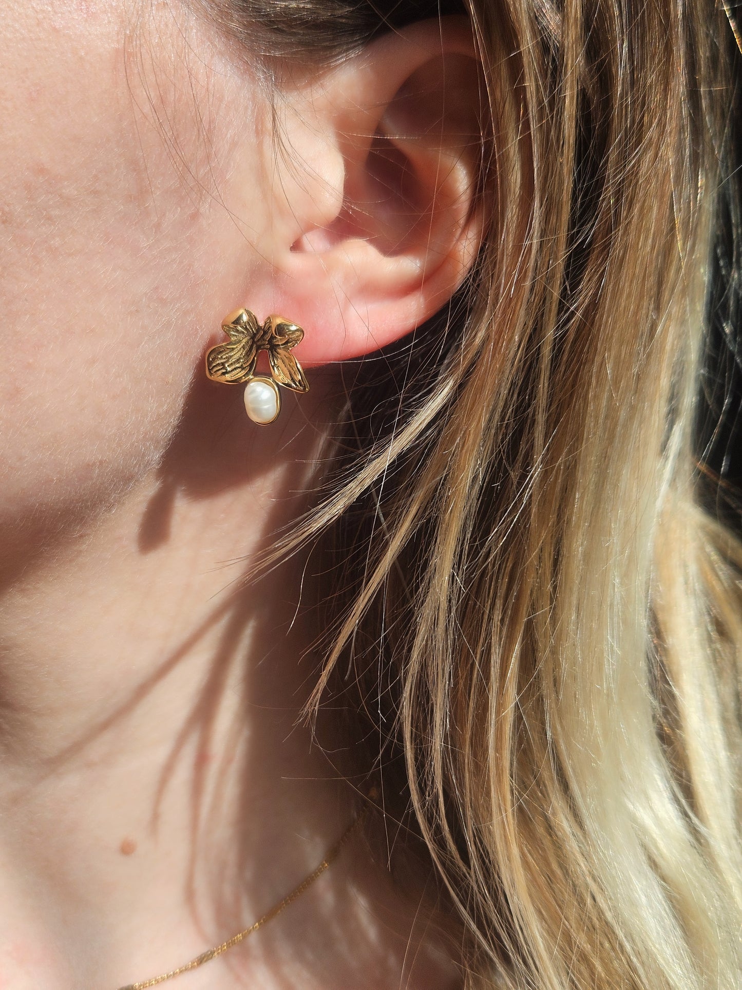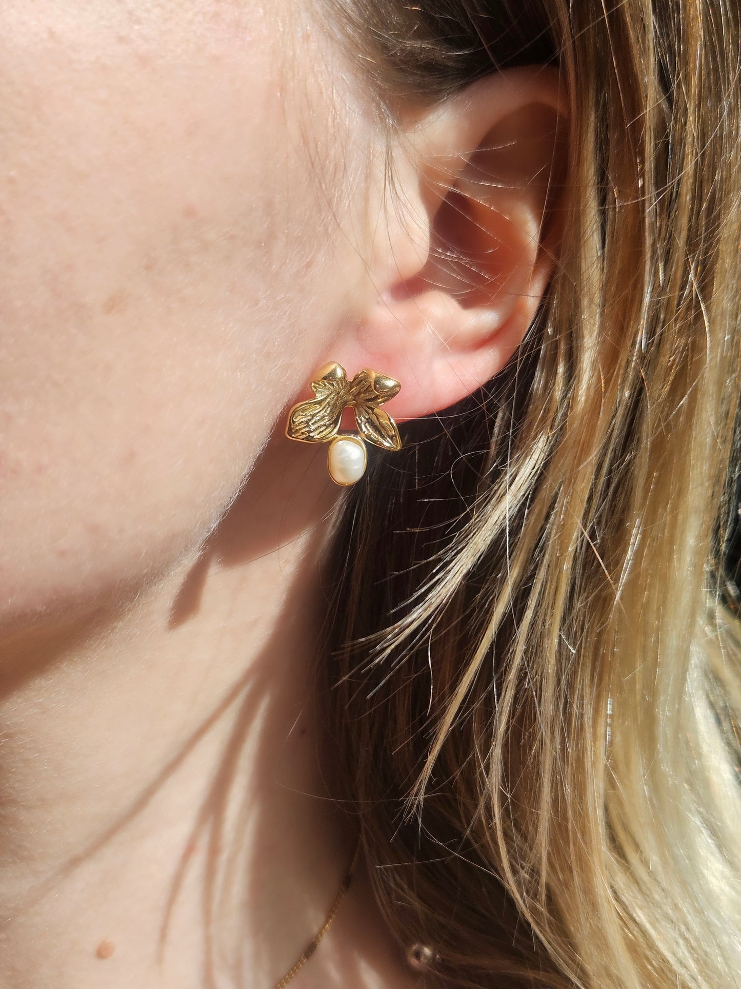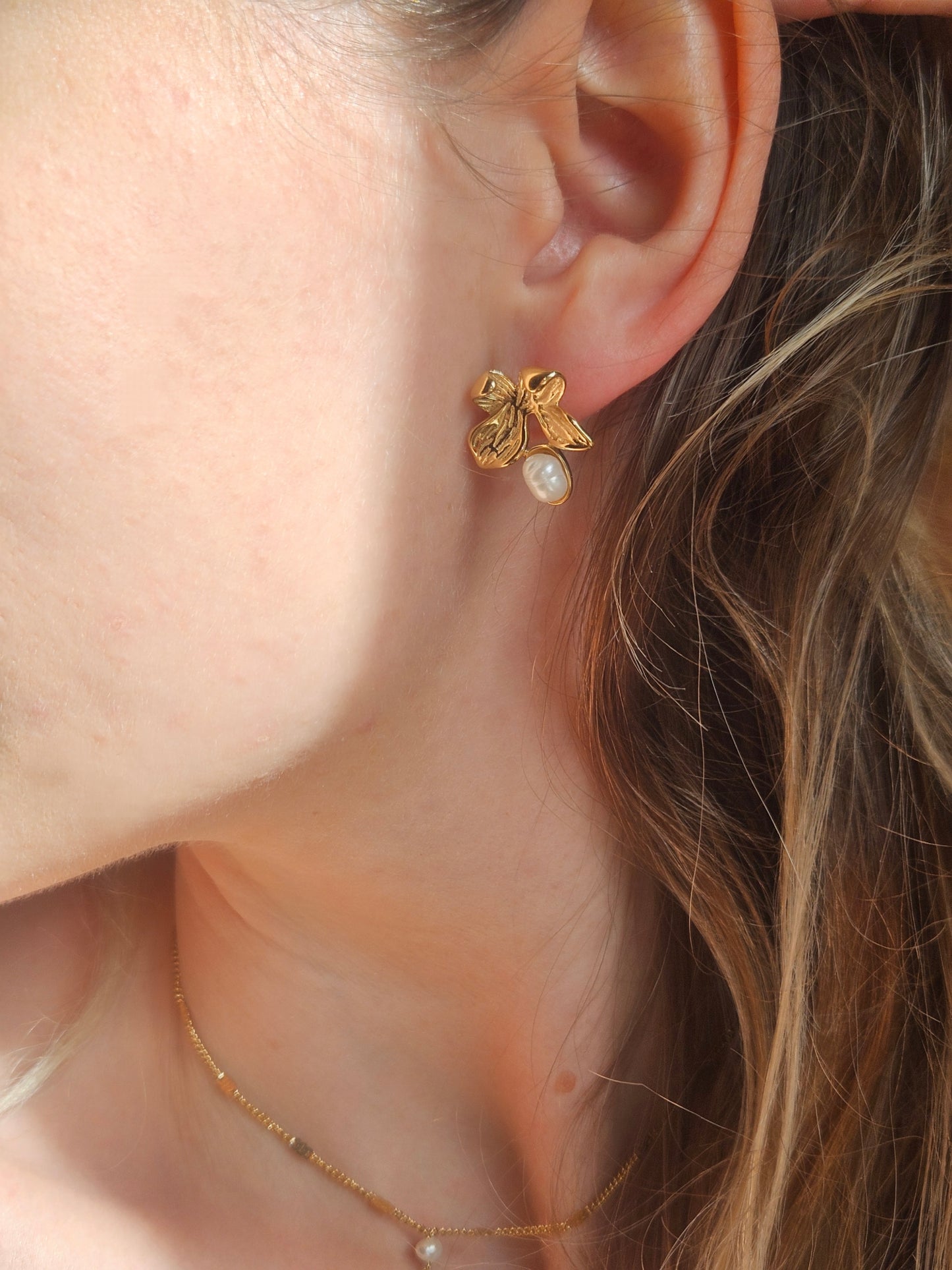 Les boucles d'oreilles Dalila contiennent une jolies perles d'eau douce délicatement posée sur sa base en forme de noeud.