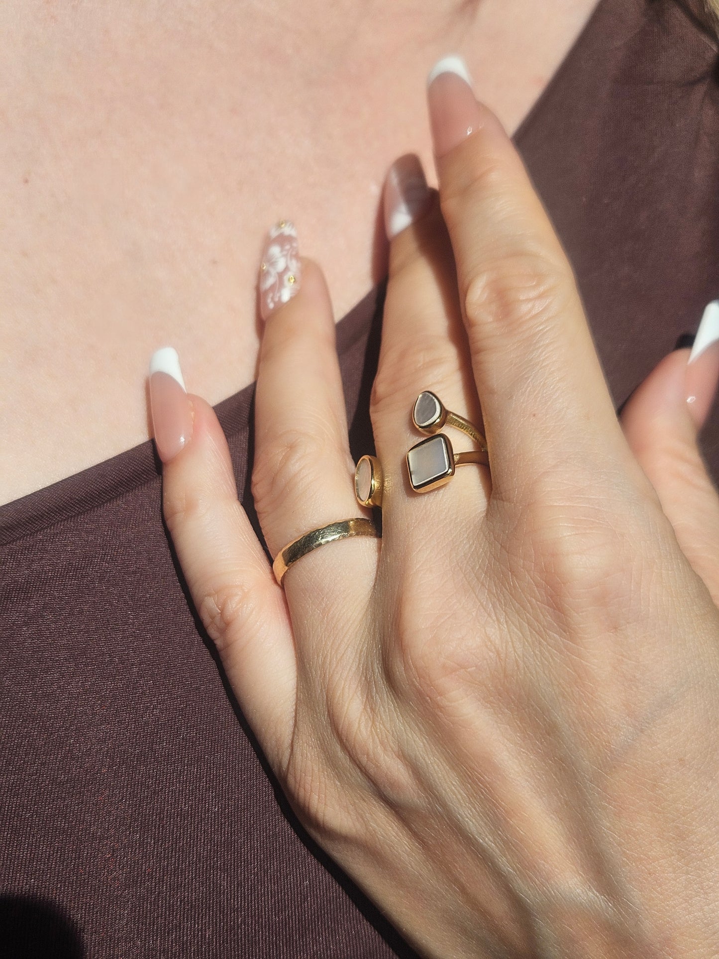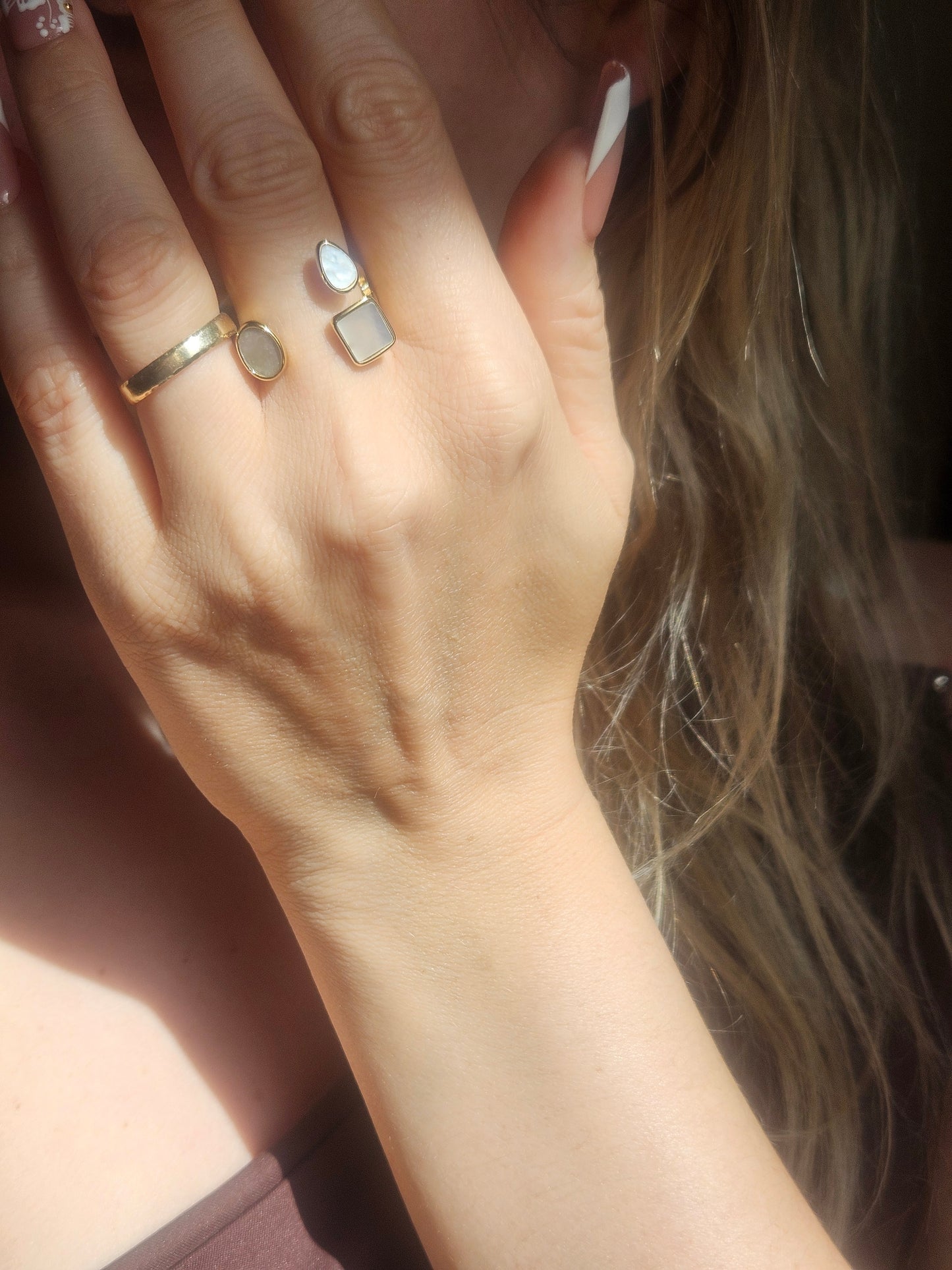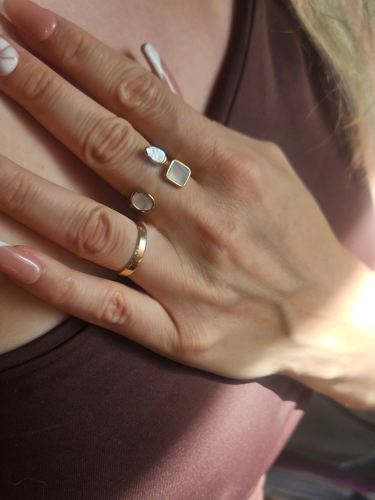 La bague Hibia contient trois pierres de nacre offrant à ce bijou beauté et éclat naturel. Son ouverture à l'avant vous confère un confort absolu.