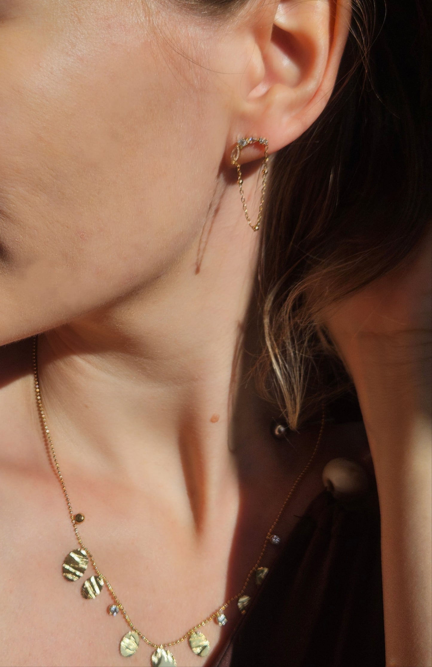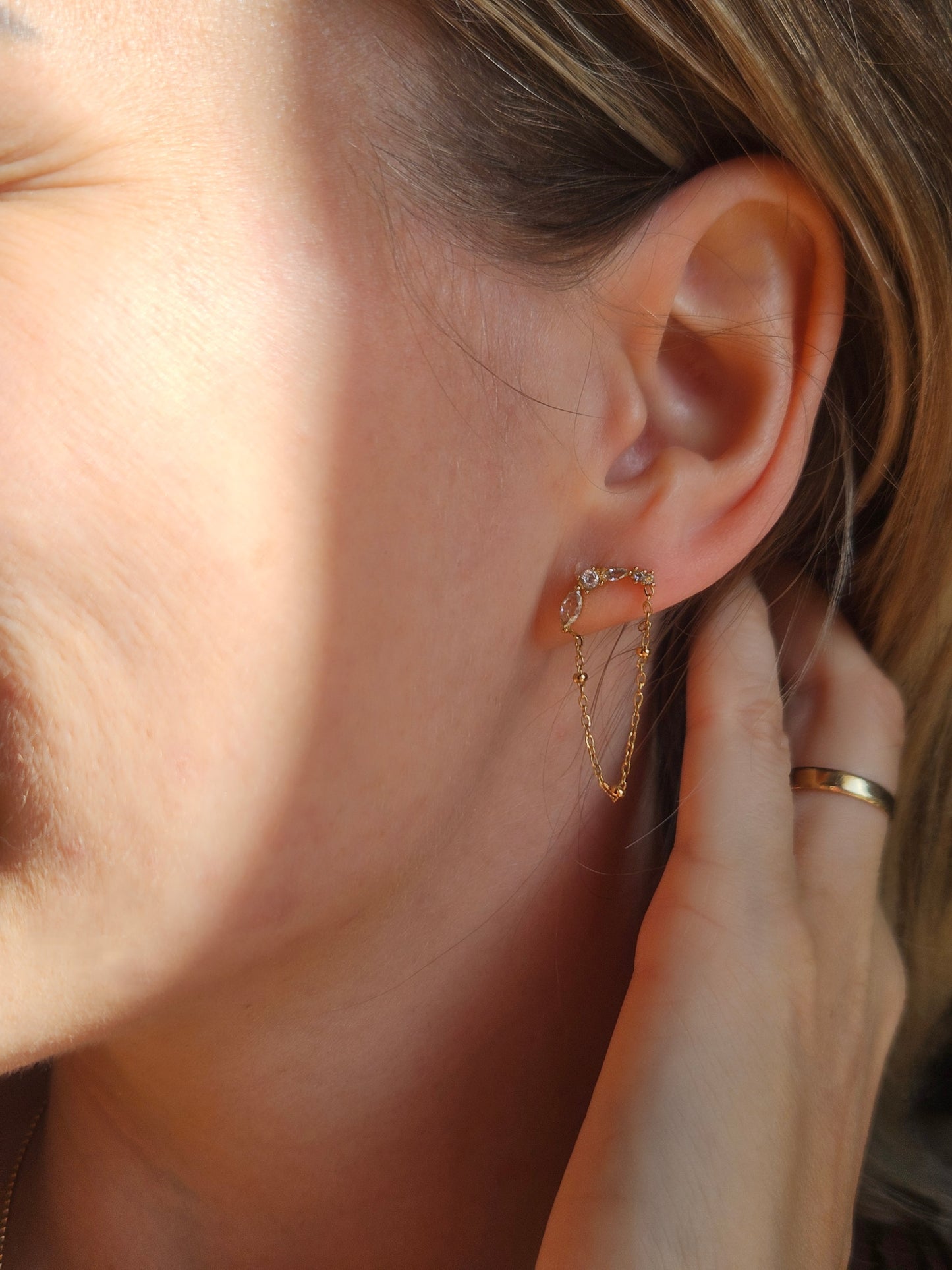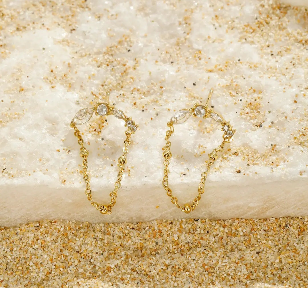 Les jolies boucles d'oreilles Linda contiennent des oxydes de zirconium et strass. Une chaine pendante confère à ce bijou de l'originalité. Brillantes, lumineuses et chics, ce bijou sublimera votre tenue.