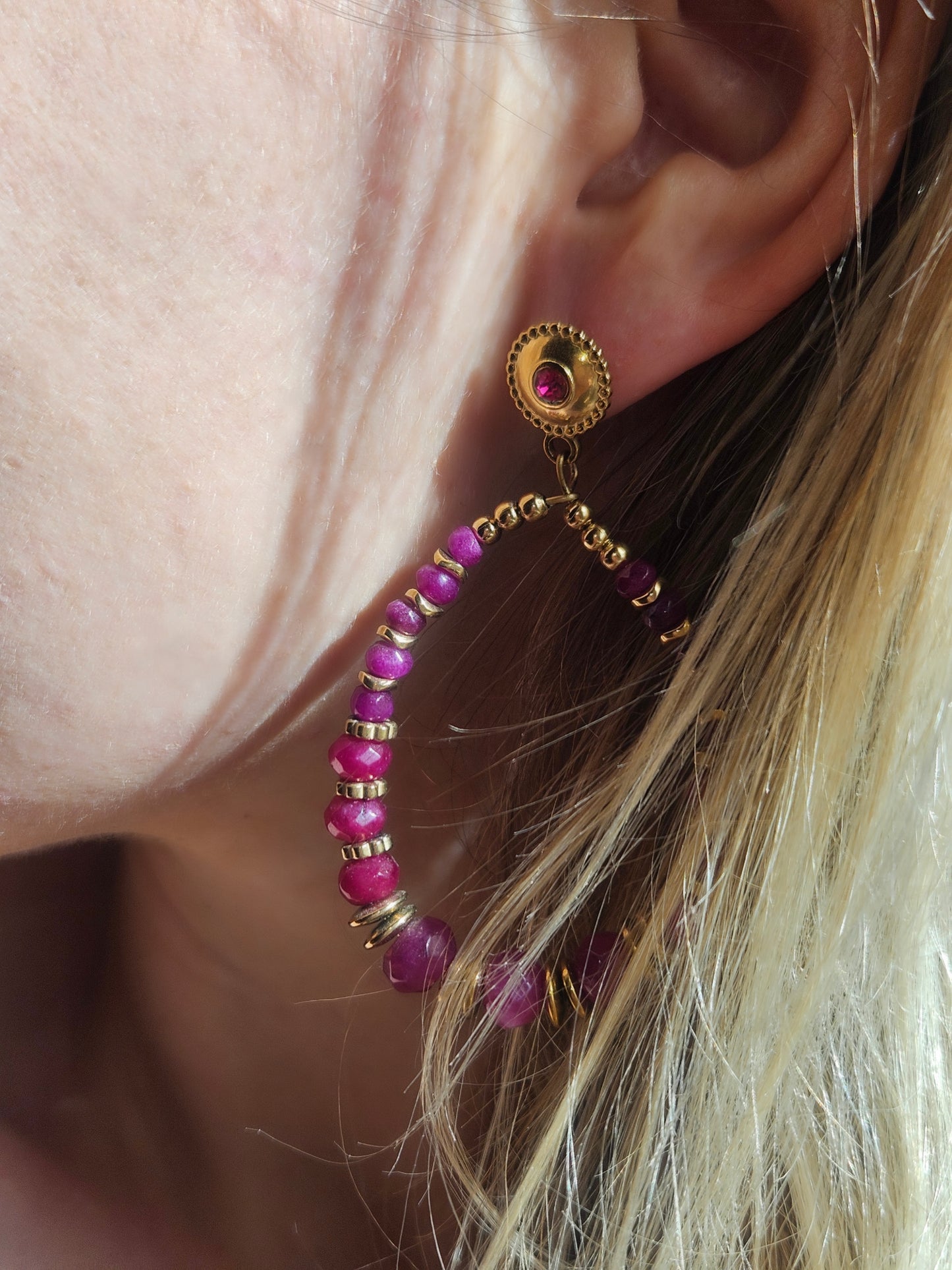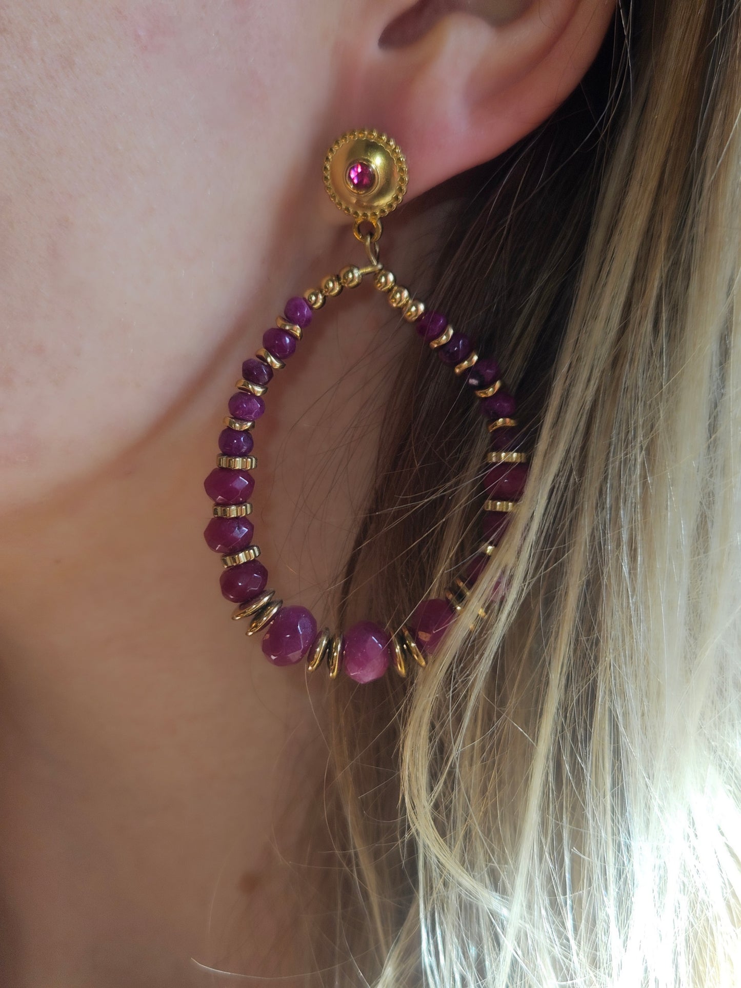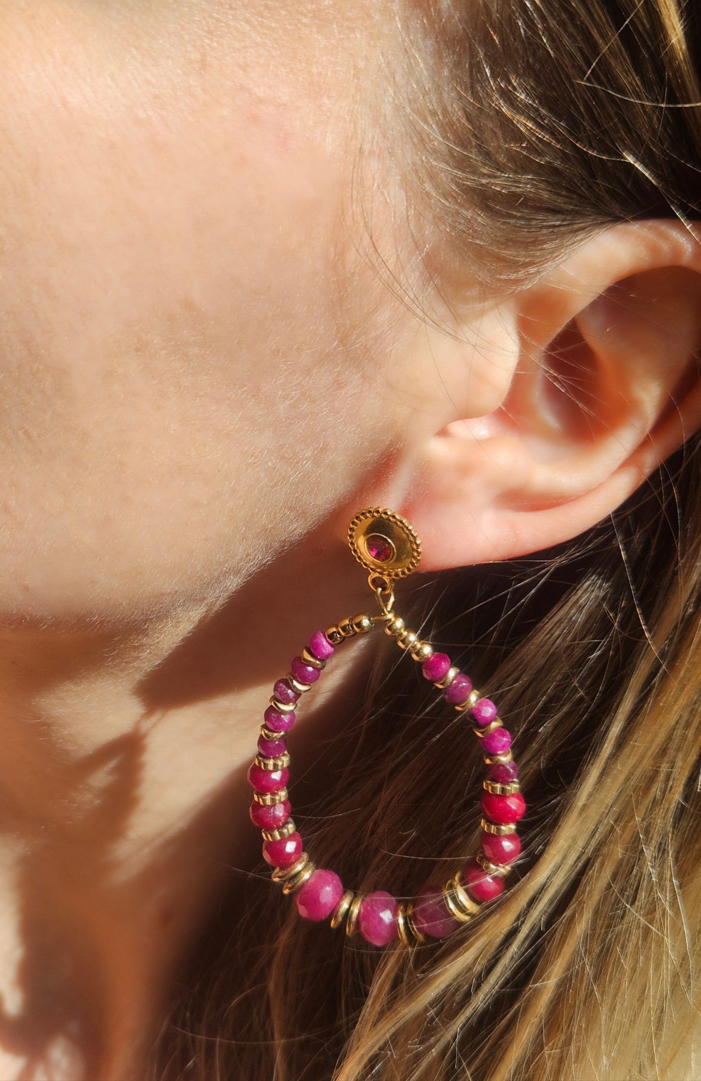 Lea boucles d'oreilles Maeva sont de couleur mauve, fushia.