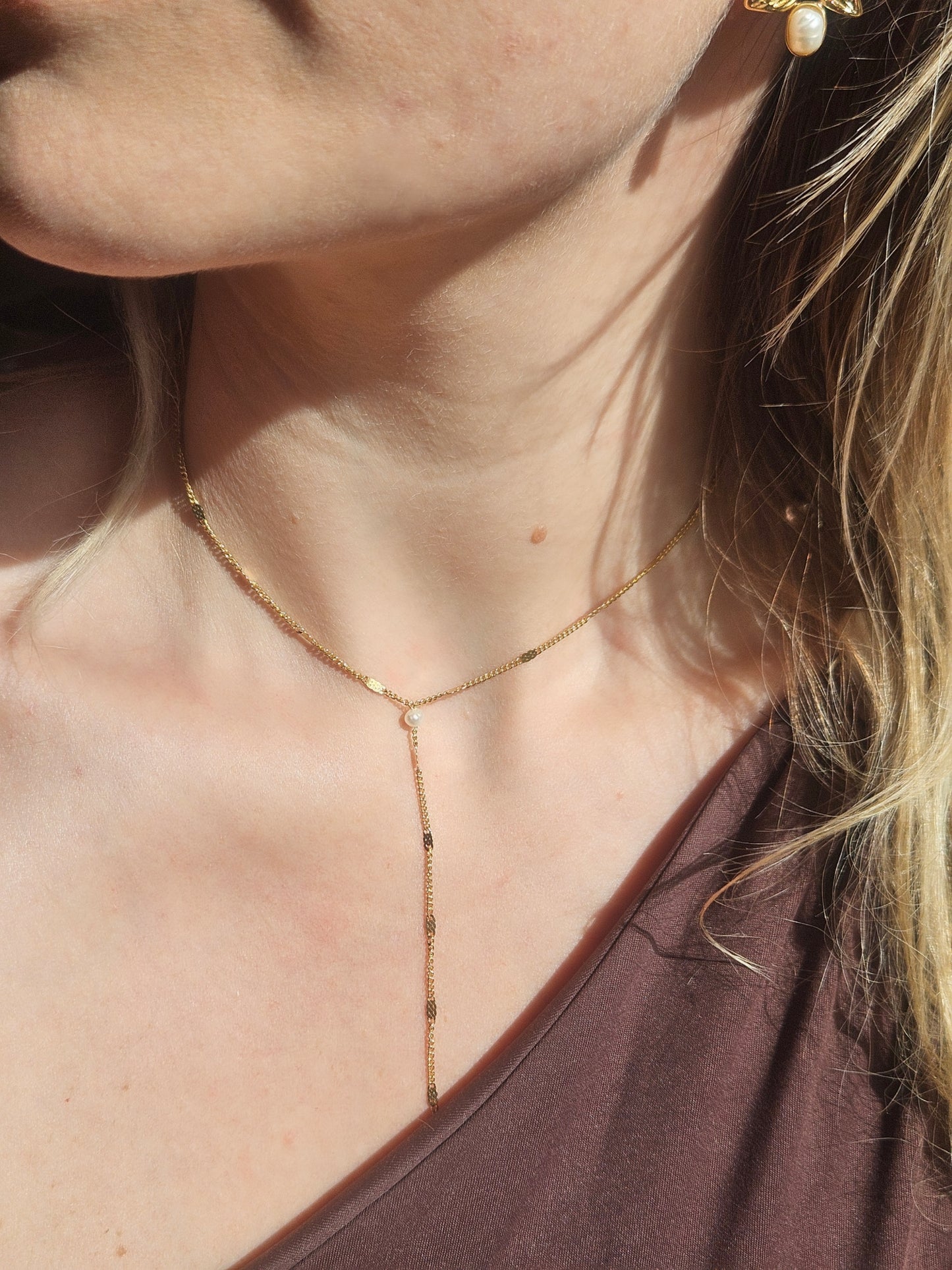 Le collier Malika fait main contient une jolie perle de culture accordant pureté et beauté à ce collier Y unique. Les colliers Y sont les bijoux par excellence pour sublimer son décolleté avec finesse et féminité