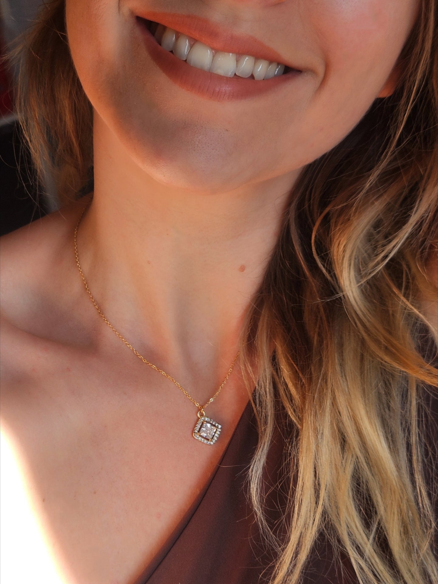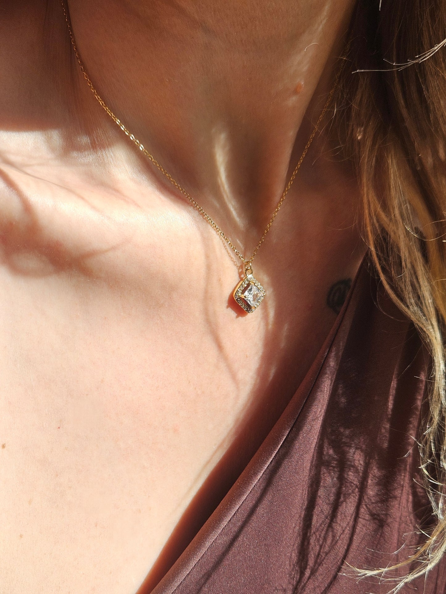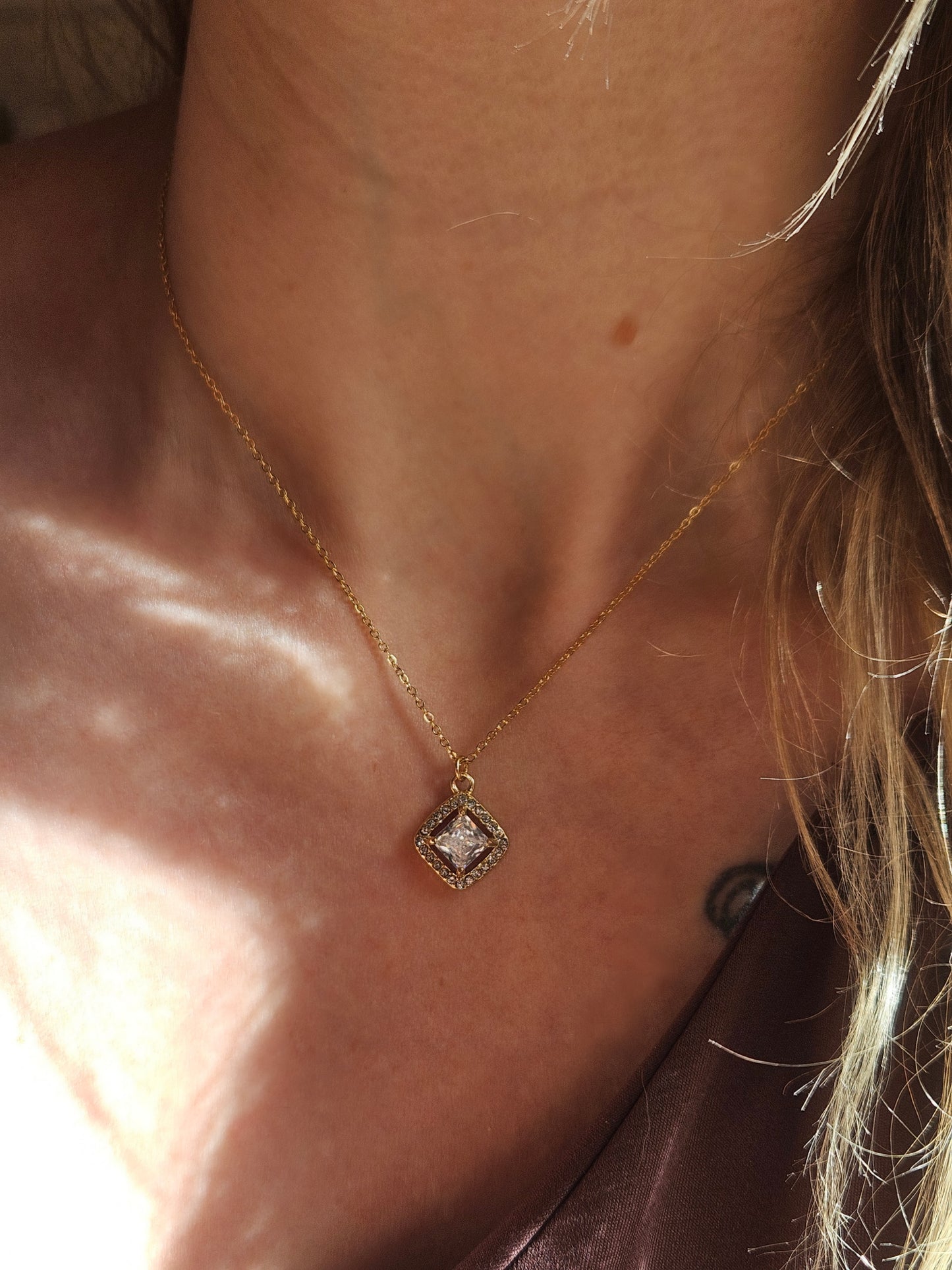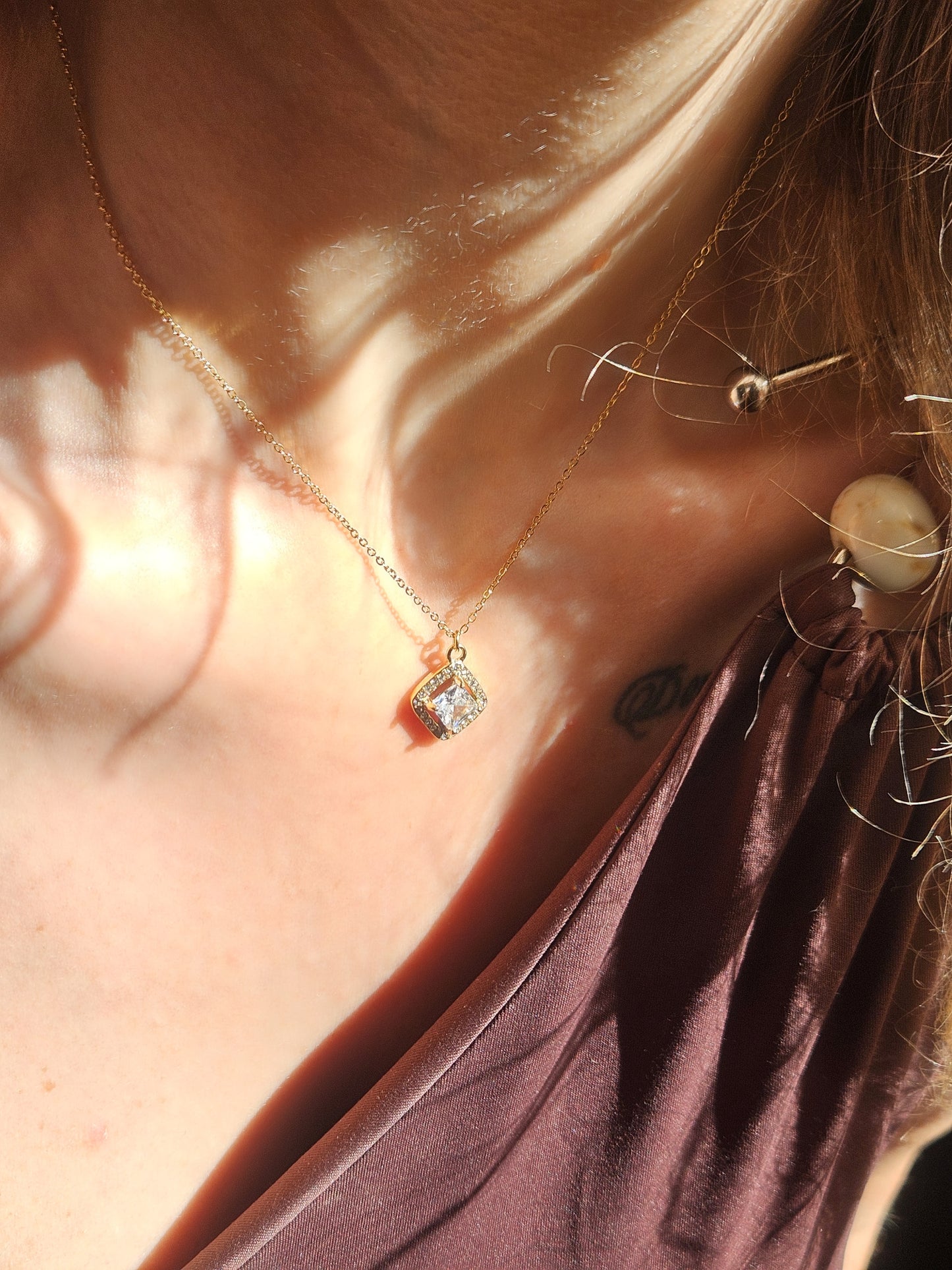 Le collier Maona contient un pendantf de forme de lozange, avec de jolis strass et oxyde de zirconium. Sa brillance sublimera chacune de votre tenue.